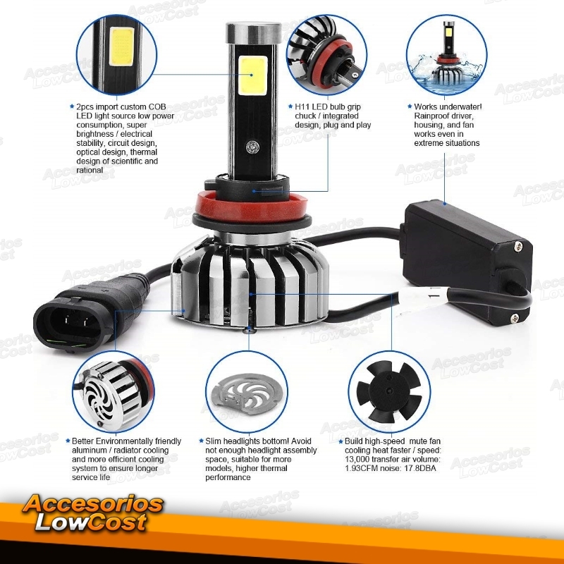 KIT de dos bombillas LED H11. Fabricante N7. Temperatura de color: 6000K. Alimentación 12V / 2A. Dispone de base con disipador que incluye ventilador para una mejor disipación de calor.