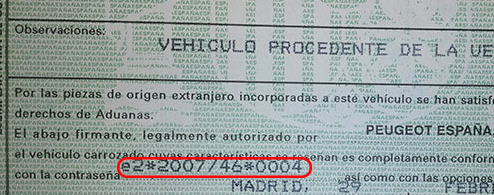 Ejemplo de contraseñas de homologación del vehículo en documento: