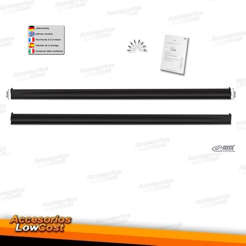 Contenido del envío: > Juego de faldones laterales (izquierdo y derecho) > Accesorios de instalación > Homologación TÜV, ¡sin necesidad de registro! > Instrucciones de instalación.