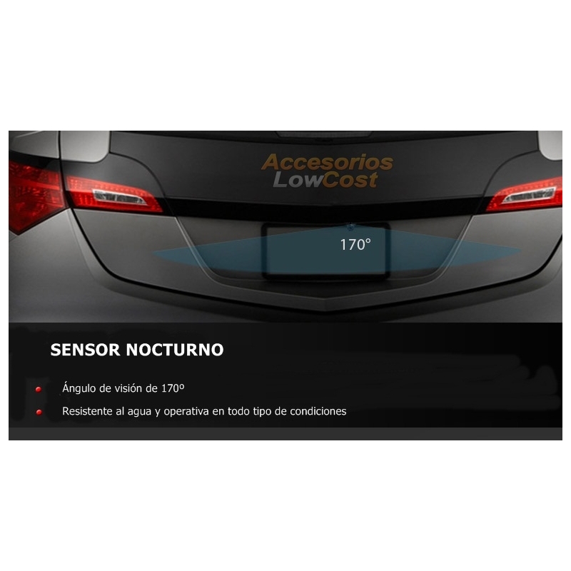 Cámara de marcha atrás con modo nocturno LED en color. Gran angular de 170 grados . Resistente al agua. Funciona sin ningún problema entre -30 y 65 grados. Formato de vídeo PAL