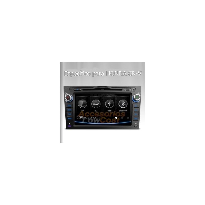 Radio GPS DVD 2 DIN específico para Honda CR-V anterior a 2012. Pantalla táctil HD de 7 pulgadas. 800x480. Mapas de España y Europa. Función PIP y Dual Zone (permite ver dos imágenes en pantalla al mismo tiempo y simultanear GPS y reproducción DVD o CD). Bluetooth manos libres. FM, AM y RDS. Puerto USB y SD hasta 32 GB. Puerto iPod y iPhone. Control mandos volante. Conexión para cámara marcha atrás (cámara no incluida). Envío contra reembolso a toda España. Entrega en 24 horas.