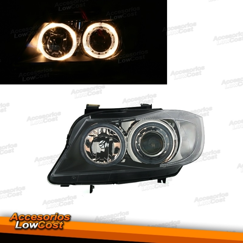 Faros con ojos de angel para BMW E90 y E91, Mod. 1/05 -1/09.Fondo color negro. Tipo de bombillas: H7+H7; intermitencia P21W. Luz de posición "halo". Para vehículos con regulación eléctrica (no incluye servomotor de regulación). En el precio se incluyen los dos faros. Homologación E-Mark (certificado europeo) grabado en el cristal del faro. Posibilidad de envío con kit de xenon.
