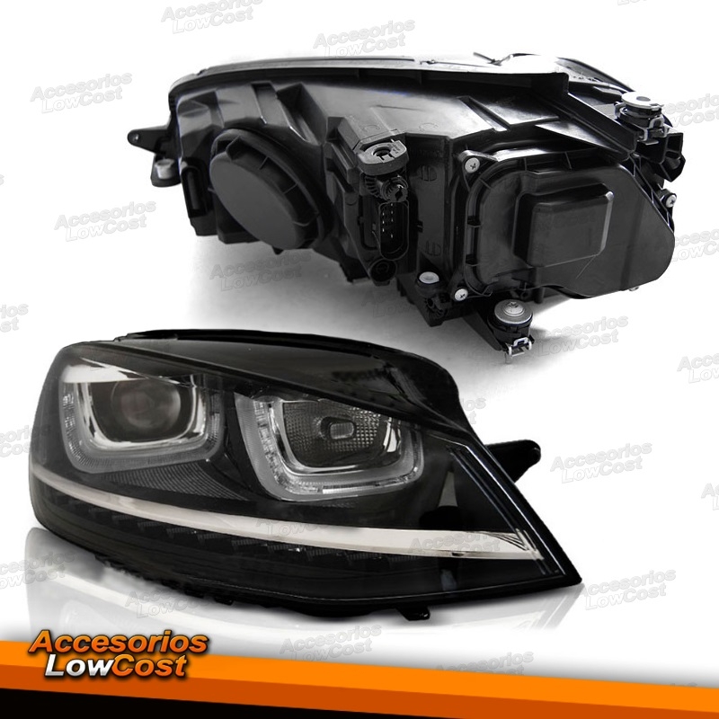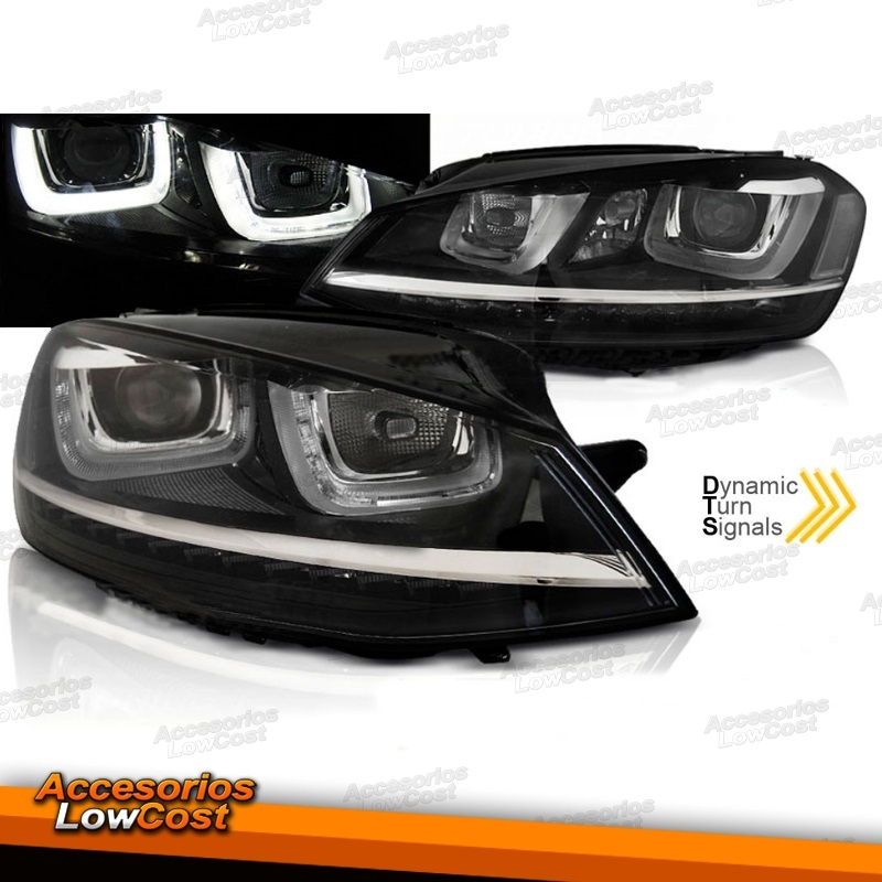 FAROS DELANTEROS CON DIURNA DRL LED E INTERMITENTE LED DINÁMICO PARA VW GOLF VII, 11/12-17, TIPO U, fondo negro.