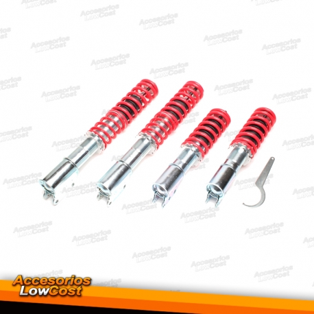 Nuevo modelo de doble muelle, regulables en altura (hasta -70 mm) y en dureza, variable según altura; cuanto más rebajadas, más duras, tanto en eje delantero como en eje trasero.Proporcionan un mayor agarre y un mejor paso por curva. Mejora tu experiencia de conducción con estos amortiguadores deportivos regulables, a la vez que cambias la imagen del coche.