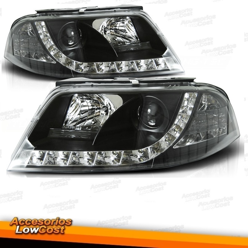 FAROS DELANTEROS PARA VW PASSAT 3BG Mod. 11/00-5/05 con luz diurna de LED. Fondo color negro.