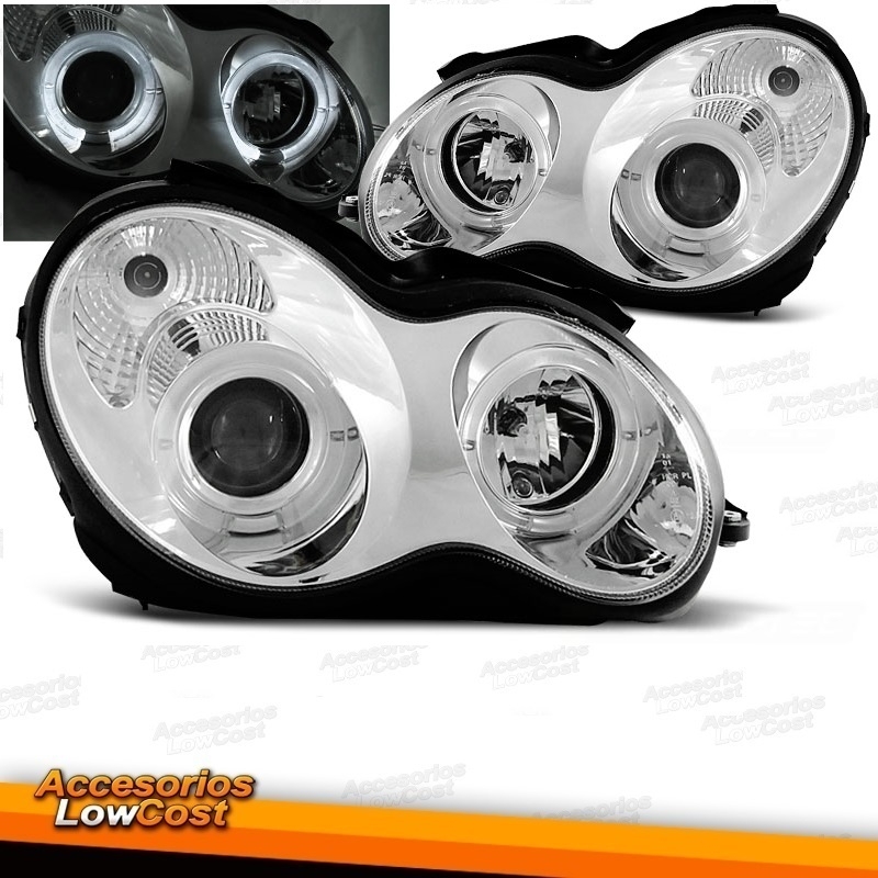 Faros Mercedes con Ojos de Angel para Mercedes clase C W203 5/00-2/07. Fondo color cromo.
