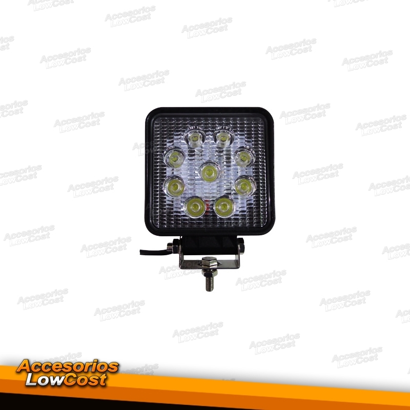 Farol de luz de trabalho LED de 12/24V, 27W / 1900 Lumens. Compatível com veículos de 12 / 24 Voltos. 9 LED de 3w Super Branco. Medidas: 11 X 11 cm / 6 cm de profundidade. Iluminação: 1900 lumens. Impermeável IP68. Acessórios de montagem em inox incluídos.