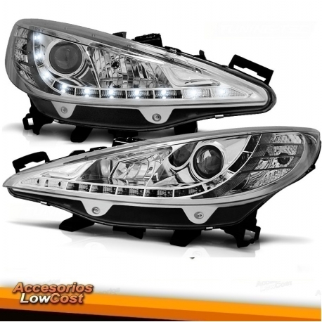 FARÓIS COM LUZ DIURNA LED COM PROJETOR ( OLHO DE BOI ) PARA PEUGEOT 207 de 2006 a 2012.